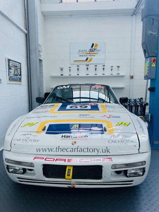 The IIRT Porsche 944 S2 is pictured in the race bay at The Car Factory (TCF), a Leicester-based fully-refurbished luxury car venue for exclusive storage and events space and home to TCF Members' Club and The Dream Factory.